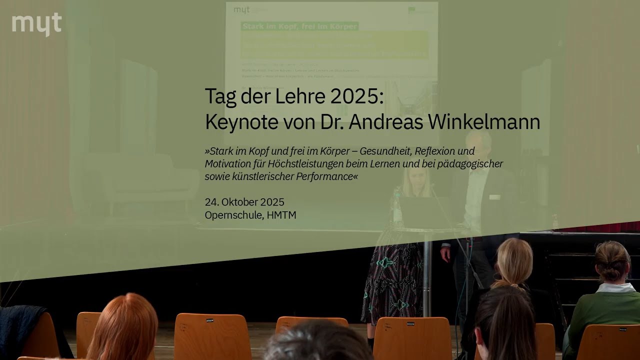 Nach einer Begrüßung durch die AG Lehre der HMTM, die den Tag organisierte, sprach Prof. Dr. Sonja Stibi die eröffnenden Worte. Dr. Andreas Winkelmann, Leitung Physikalische und Rehabilitative Medizin am LMU Klinikum, widmete sich in seiner Keynote dem Thema »Gesundheit, Reflexion und Motivation für Höchstleistungen beim Lernen und bei pädagogischer sowie künstlerischer Performance«.